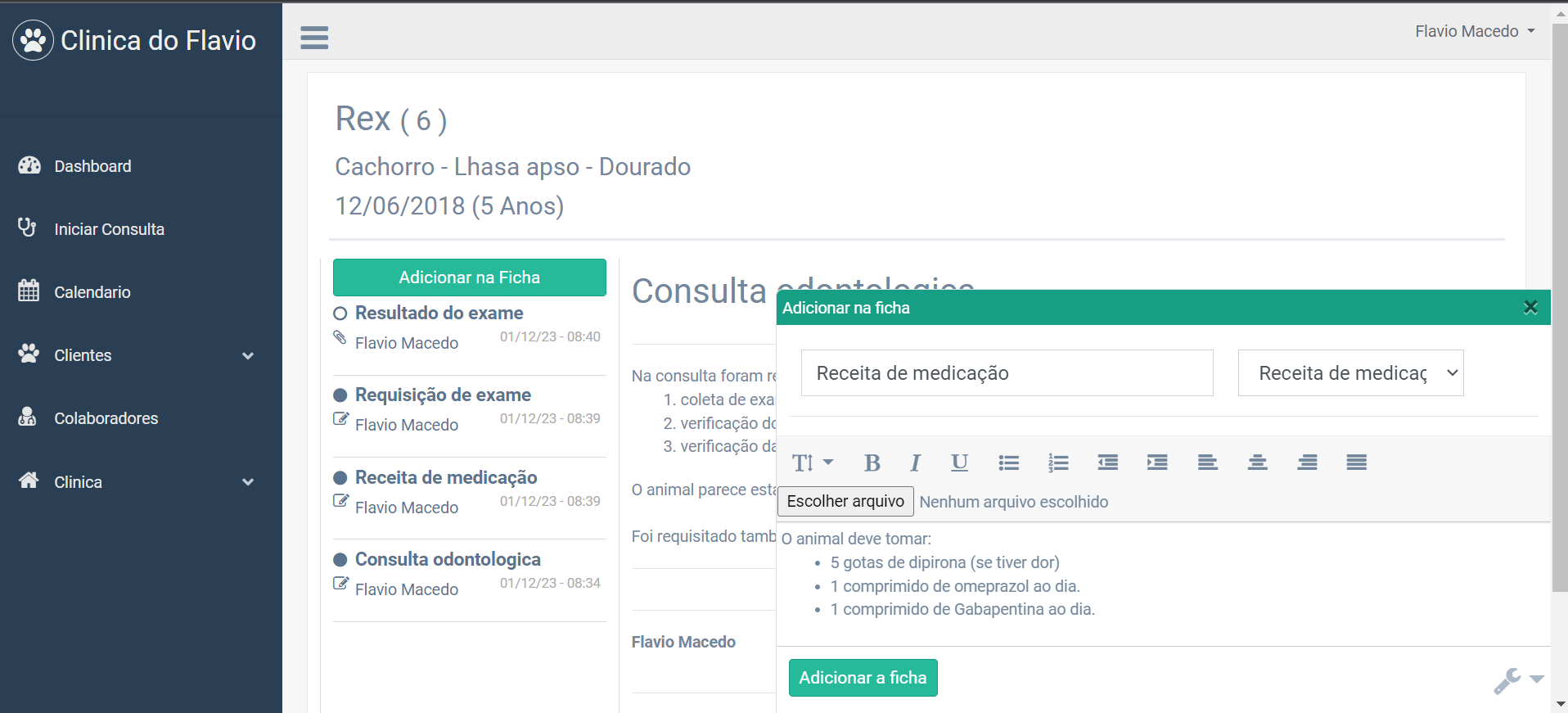 Ficha Vet é um software especializado em atender clínicas veterinárias. Nosso sistema proporciona uma gestão simplificada dos clientes e da agenda da clínica, permitindo que profissionais veterinários organizem e aprimorem o atendimento. Com uma interface intuitiva, oferecemos uma solução eficaz para simplificar a rotina clínica, desde o registro de informações até a coordenação de agendamentos, promovendo uma prática veterinária mais eficiente e um controle simplificado.
